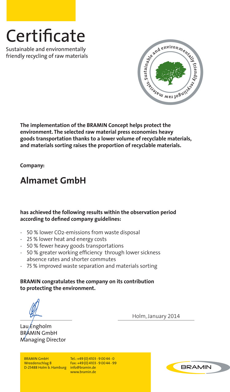 ALMAMET takes responsibility for the environment to ensure that our environment is a place worth living also for future generations. We have developed strategies and taken specific action towards the environment and the earth’s resources.