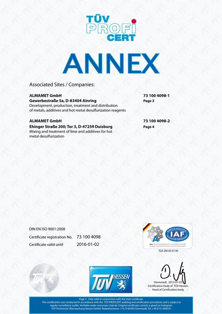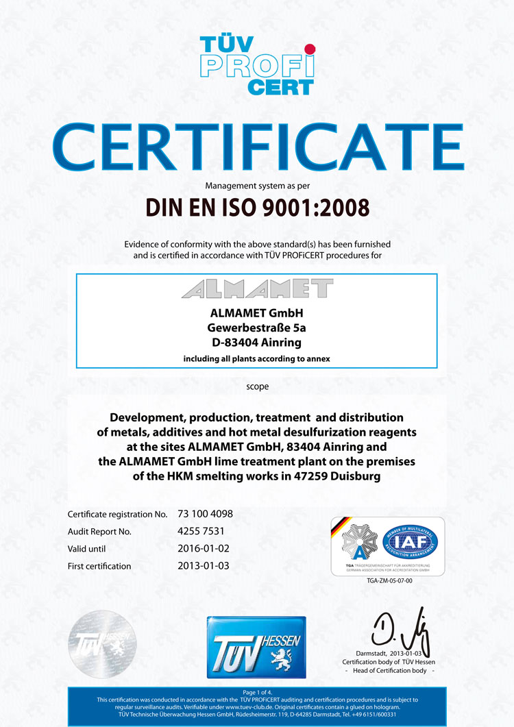 ALMAMET is an ISO 9001:2008 certified organization complying with all the requisites of the Quality Management System in order to adhere to our commitment of continual improvement and innovation of quality products. Using ISO 9001:2008 ALMAMET assures that customers get consistent, top quality products and services.
