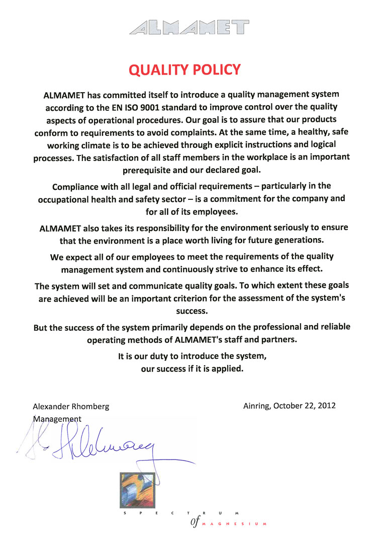 Since the foundation of ALMAMET, “Quality” plays an essential role throughout the whole organization and group. ALMAMET is always eager of exceeding expectations, whether you are a customer, supplier, employee or any other organization or person having an interest on ALMAMET. Exceeding expectations is one of the core values of our organization and is being communicated day by day.