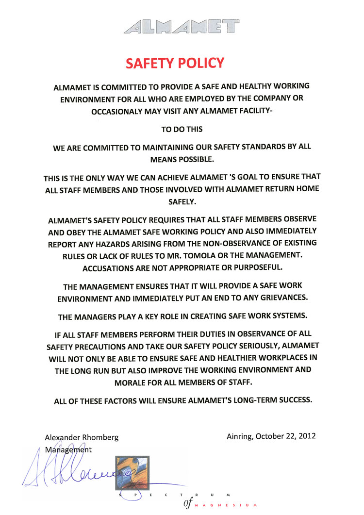 ALMAMET ensures a healthy, safe working condition through explicit instructions and logical processes. Twice a year ALMAMET is the organizer of a large safety seminar where customers, suppliers, employees and other concerned person are invited. In September 2019 Almamet’s Safety Seminar was held in Manchester, England and the upcoming safety seminar will be held in Germany in March,2020. ALMAMET has committed itself to maintain and further develop current safety standards.